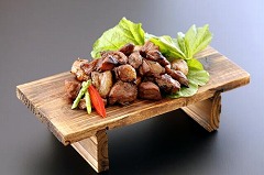 一口サイズにカットした黒豚肉を本醸造醤油、天然塩、香辛料で味付けし、炭火で焼き上げました。元々はまかない飯だったものを商品化。黒豚の旨み、食欲をそそる炭火の薫りがたまらない一品です。香辛料もピリッときいているので、お酒のおつまみにもオススメです!