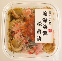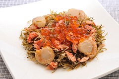 北海道産の郷土料理、松前漬の上に数の子、帆立貝、ずわいがに、いくらをトッピングした豪華な松前漬です。