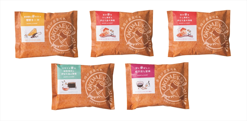 〈内容量〉手揚げ京あられ9粒入×5袋(旨み香る干し海老と伊豆大島の海塩×2袋、甘く香ばしい炊き出し醤油・ふわりと香る国産海苔と伊豆大島の海塩・黒胡椒と香り立つ燻製チーズ×各1袋)