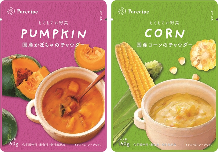 国産かぼちゃの甘みといんげんまめの食感がちょうどよいかぼちゃチャウダーと国産とうもろこしと野菜を使ったコーンチャウダー。具だくさんの食べるスープです。食卓に手軽にプラスできるスープセット。