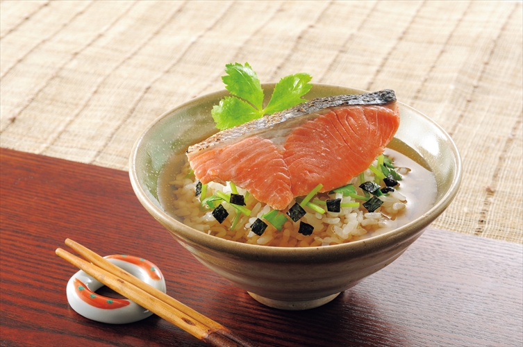 大ぶりに切った焼き紅鮭の身を一枚添えました。ご飯にのせ、和風だしをかけ、ほぐしながらお召し上がり頂けます。