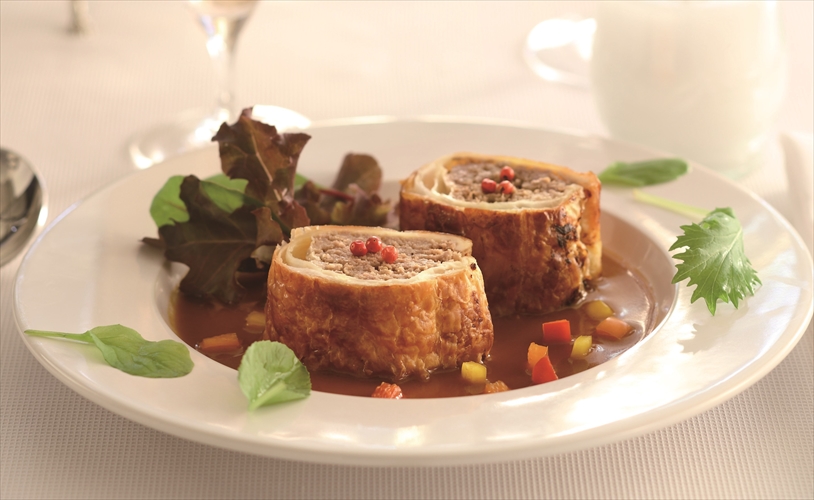 牛肉は国産黒毛和牛のみを使用し、パイ生地で包んでじっくり焼きあげ旨みをとじ込めたビーフパイです。パイ生地のサクサクした食感と、黒毛和牛と野菜の旨みを、マデラ酒の上品な甘みと香りのソースがひとつにまとめています。