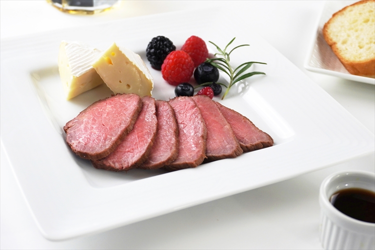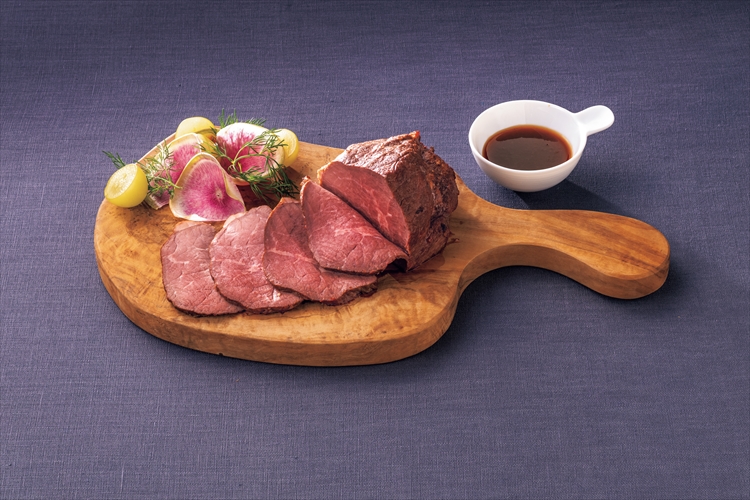 氷温で熟成させ、素材のおいしさを引き出したもも肉を使用したローストビーフです。赤身で牛肉本来の味が濃いのが特長です。玉ねぎの旨みとフルーツや蜂蜜の程よい甘みがローストビーフにピッタリな、醤油ベースのオニオンソースでお召しあがりください。