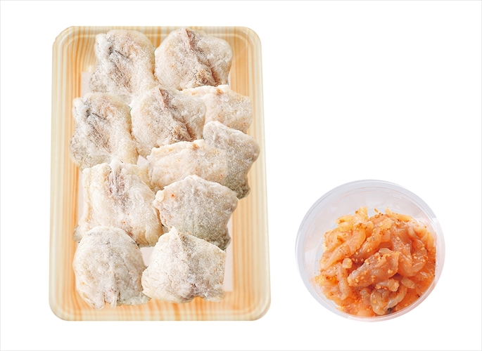 しろさばふくをおいしく唐揚用に調理しました。一匹のとらふくからわずかしか取れない身皮と、とらふくの身を独自に味付した塩辛も格別の味。熱々のごはんに乗せ、お茶をかけて「とらふく生茶漬け」としてもお楽しみいただけます。