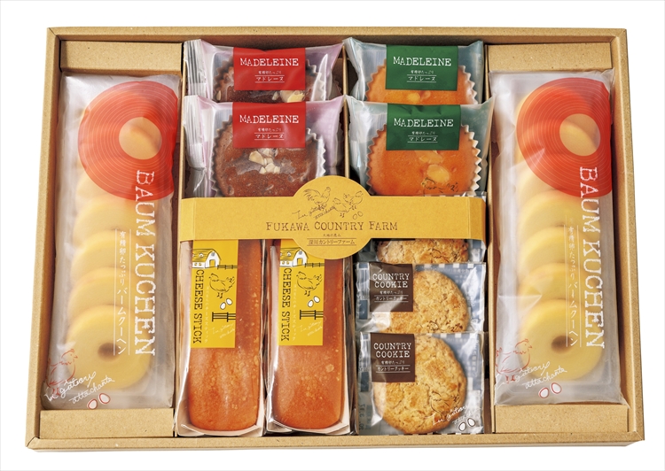 自然の恵みにあふれた環境で育った鶏からとれる、新鮮な有精卵を使ったスイーツは多くのお客様に愛されています。深川カントリーファームが生み出すスイーツはたまごのコクがありながら、自然で上品な甘さ、素朴で飽きのこない味わいが魅力です。1層ずつ丁寧に焼き上げたバームクーヘンをはじめ、ふんわりマドレーヌ、ざくざく食感のオートミールクッキーなどバラエティ豊かな詰合せ。