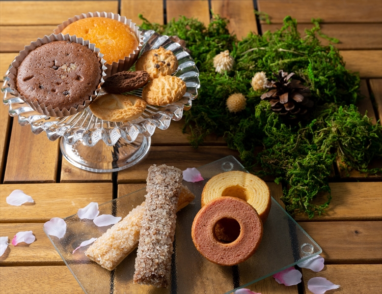 〈内容量〉しっとりバームクーヘン・しっとりバームクーヘン苺×各1、有精卵たっぷりマドレーヌ(プレーン・ショコラ×各1)、香ばしくて素朴なクッキー(ミルク・ショコラ・メープル・チョコチップ×各1)、さくさくスティックパイ(メープル・ショコラ×各1)