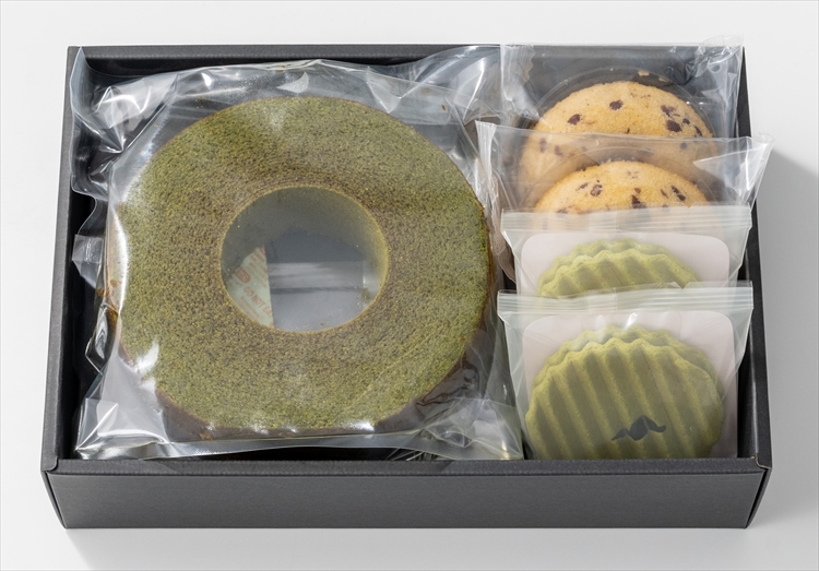 元禄年間創業の老舗「丸久小山園」の宇治抹茶を使用した上品で芳醇な香りが広がるバウムクーヘン。優しい甘さの小豆の焼きドーナツに厚みのある波型クッキーに、口どけの良いクリームをサンドしたヴァッフェルもご一緒に。