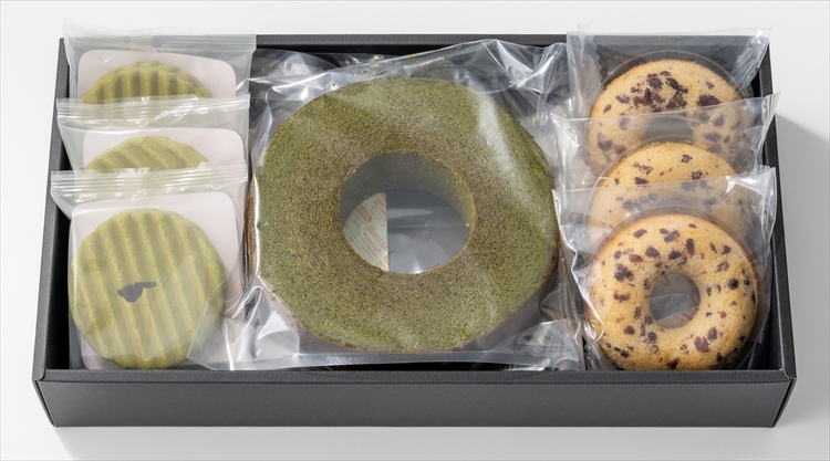 〈内容量〉宇治抹茶バウムクーヘン×1個、小豆ドーナツ×2個、ヴァッフェル×2個