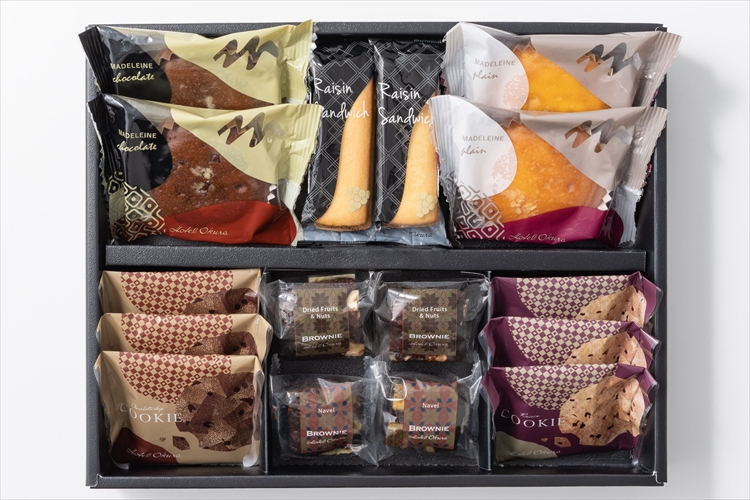 〈内容量〉レーズンクッキー・チョコチップクッキー×各3個、レーズンサンド・ブラウニー(ネーブル・ドライフルーツ&ナッツ)・マドレーヌ(プレーン・チョコ)×各2個