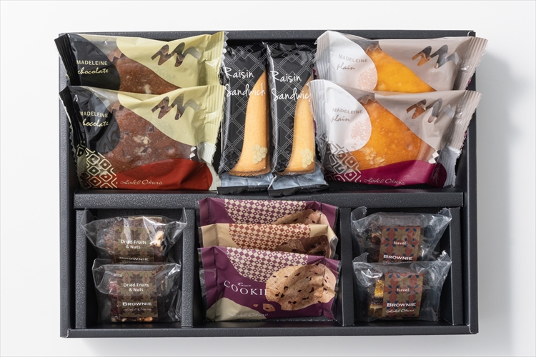 〈内容量〉ブラウニー(ネーブル・ドライフルーツ&ナッツ)・レーズンサンド・マドレーヌ(プレーン・チョコ)・レーズンクッキー×各2個、チョコチップクッキー×1個