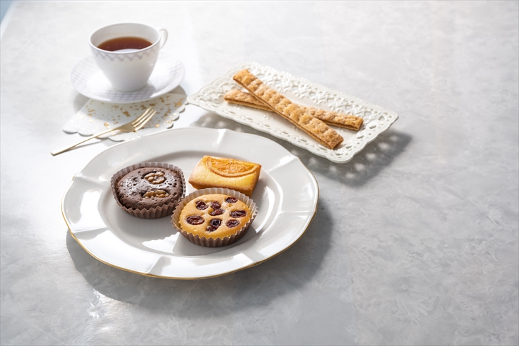 しっとり生地にフルーツやナッツを飾ったプチケーキやオレンジケーキ、さくっとした食感の中にキャラメルの風味が香る少し長いサイズのロングパイ。ホテルの豊かなティータイムを演出するスイーツを詰め合わせました。