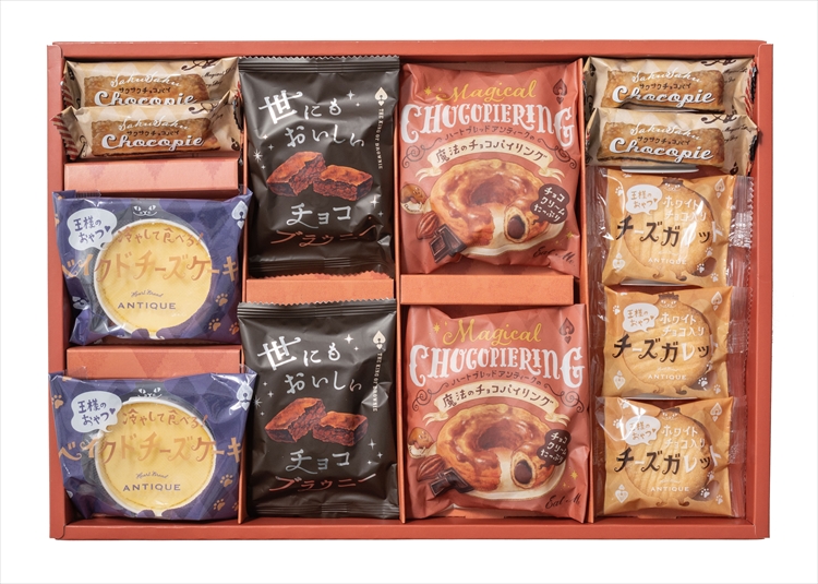 〈内容量〉サクサクチョコパイ×4個、ホワイトチョコ入りチーズガレット×3個、世にもおいしいチョコブラウニー・冷やして食べる!ベイクドチーズケーキ・魔法のチョコパイリング×各2個