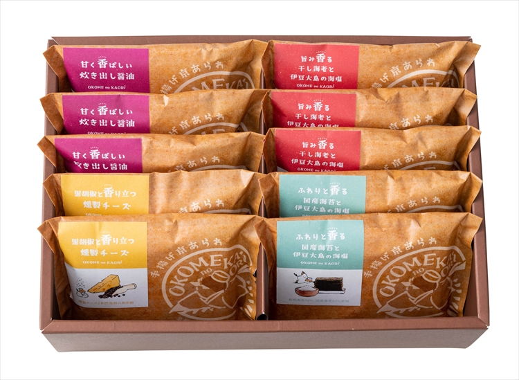 〈内容量〉手揚げ京あられ×10袋(旨み香る干し海老と伊豆大島の海塩16g・甘く香ばしい炊き出し醤油15g×各3袋、ふわりと香る国産海苔と伊豆大島の海塩17g・黒胡椒と香り立つ燻製チーズ14g×各2袋)
