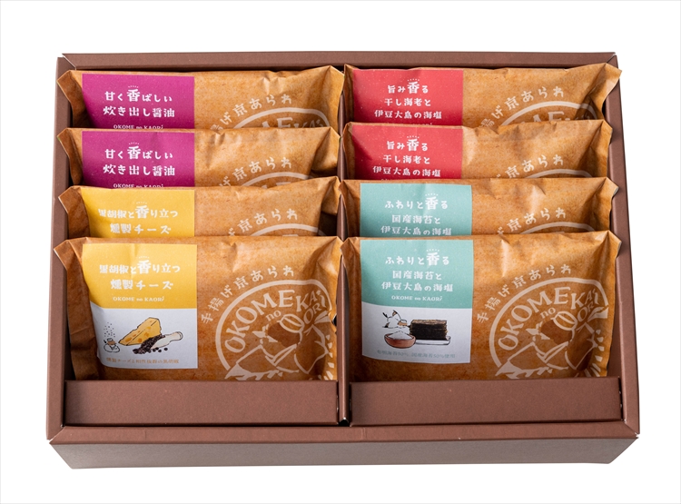 〈内容量〉手揚げ京あられ×8袋(旨み香る干し海老と伊豆大島の海塩16g・甘く香ばしい炊き出し醤油15g・ふわりと香る国産海苔と伊豆大島の海塩17g・黒胡椒と香り立つ燻製チーズ14g×各2袋)