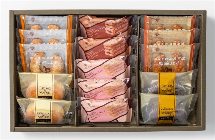 〈内容量〉馬蹄パイ(キャラメル・シュガーバター)・ミルフイユ(フランボワーズ)×各3個、ミルフイユ(キャラメルラテ)・スフレ(芳醇フロマージュ・濃厚ショコラ)×各2個