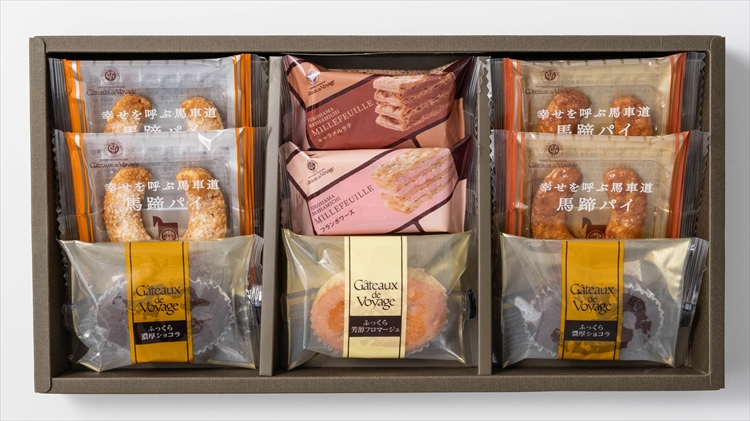 〈内容量〉馬蹄パイ(キャラメル・シュガーバター)・スフレ濃厚ショコラ×各2個、ミルフイユ(キャラメルラテ・フランボワーズ)・スフレ芳醇フロマージュ×各1個