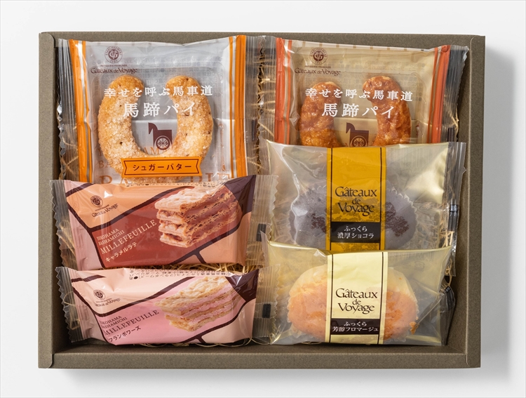 丁寧に折り重ねて焼き上げたミルフイユはパイのサクッとした食感と、とろけるクリームが織りなす贅沢なひととき。スフレは「ふくれる」の意味を持つフランス銘菓。その名の通り柔らかな食感が堪能できます。幸せを受け止め満たしてくれる縁起物として伝承されている馬蹄(ばてい)。そのU字型の馬蹄形をモチーフに作られた幸せを繋ぐ馬蹄パイの詰合せです。