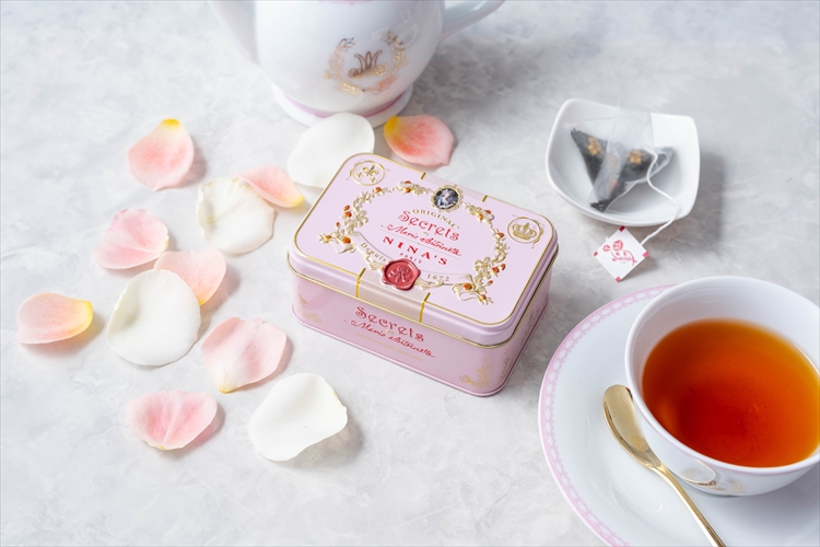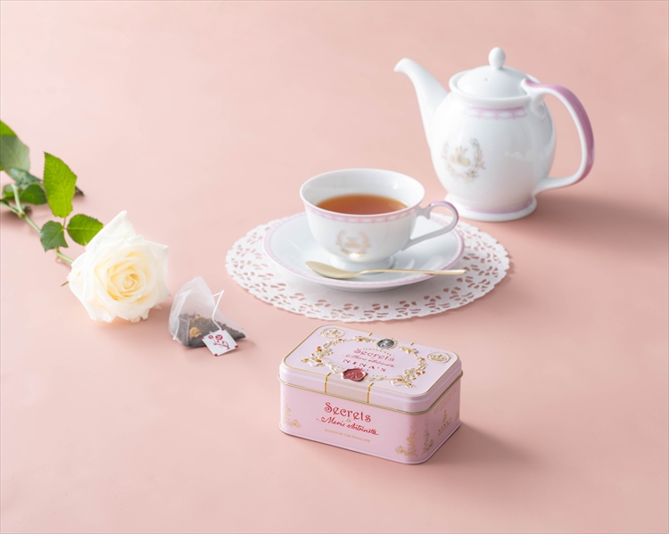 ヴェルサイユにある王妃のロイヤル シークレット ガーデンで育まれた、希少なりんごとバラの花びらで香りづけしたフレーバーティー。華やかなオリジナルロゴ入りの缶に入っており、贈り物などに最適です。