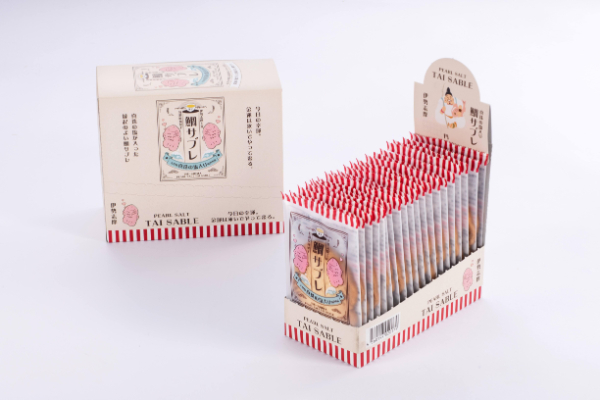 南伊勢の鯛をモチーフにした可愛いハートの形をした尻尾のサブレです。サクサクとした食感の生地には、南伊勢町産の「真珠の塩」が入っており、どこか懐かしい素朴で癖になるサブレです。