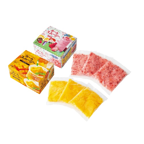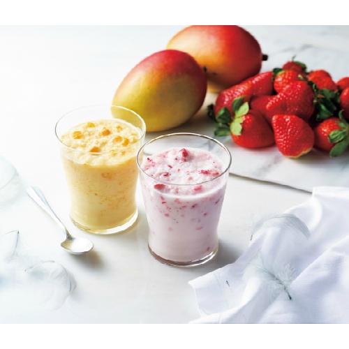雪のように細かい氷にそれぞれ苺の味、マンゴーの味付けをし、果肉を混ぜ込みました。ミルクと混ぜると簡単スムージーに、そのまま食べるとかき氷としてお召し上がり頂けます。