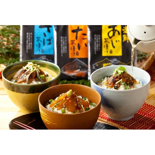 博多漁港で水揚げされた天然の真鯛・真さば・真あじを、贅沢にお茶漬けにしました。天然鮮魚ならではの食感と旨みをお楽しみいただけます。