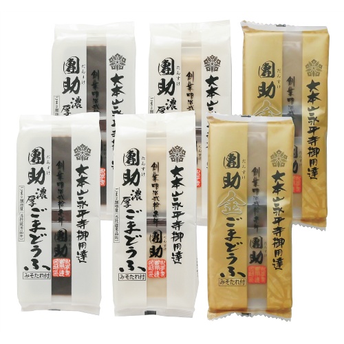 770年以上ある歴史と伝統を受け継いでいる禅の道場 曹洞宗大本山永平寺。精進料理の代表格として、永平寺に受け継がれてきた胡麻豆腐は、良質のごまと葛粉を丹念に練って作られています。胡麻を2割増量(従来品比)し、より濃厚で香ばしい風味の濃厚白・黒ごまどうふに、希少価値の高い『金胡麻』を使用した香り豊かな濃厚金ごまどうふの三種の詰合せです。