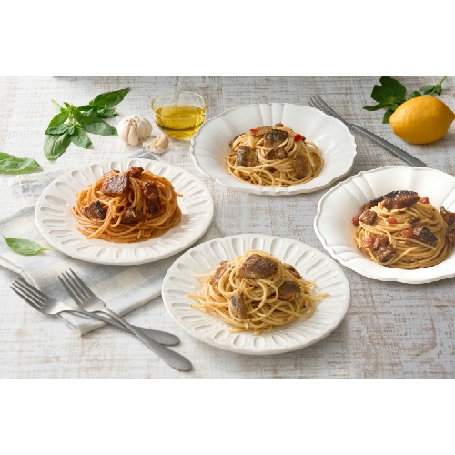 『見た目はかわいい!けれど中身は本格派』を目指して生まれたビストロ三陸シリーズから、さば・いわしを使用した和えるだけのパスタソースを。まろやかなトマトソース仕立ての「さば×ポモドーロ風」、レモンの酸味が爽やかなオイル仕立ての「いわし×塩レモン風」、ガーリックバターと醤油の風味豊かなオイル仕立ての「さば×ガリバタ醤油風」、にんにくと唐辛子の旨辛オイル仕立ての「いわし×ペペロンチーノ風」の4種セットです。
