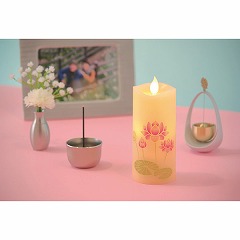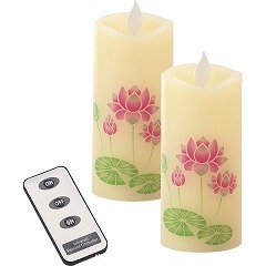 ゆらゆらとやさしく揺らぐリアルな炎は、樹脂製の炎にLEDの光を照らし、電磁石による磁力の反発を応用して限りなく自然に近い揺らぎを表現しています。ボディ全体が明るく光り、ほのかな灯りが、辺りをやさしく照らします。同柄のいろはあかり2本(リモコン付)をギフト箱に入れたご進物です。