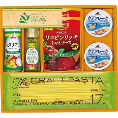 もっちりとした食感で高品質なリピーター続出のクラフトパスタや健康を意識した調味料、サラダや料理の食材としても重宝する健康オイルを使用したツナ缶などが入ったギフトセットです。本格的なパスタや洋風アレンジ料理もお楽しみいただけます。