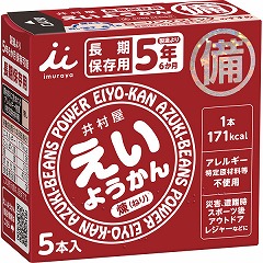 手軽にカロリー補給可能な長期保存型(賞味期限5年6ヵ月)のようかんです。非常用食品として備蓄、アウトドアーでのエネルギー補給用に携行可能。アレルゲンフリーです。内箱に「ようかん□数5本入り」と点字表示、内箱裏面には災害用伝言ダイヤルの利用方法を表示してあります。