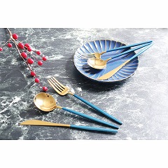 煌びやかな金色の本体と、ブルーの柄が印象的。デザイン性が高くお祝い事にもピッタリ。シンプルな食器と合わせたり、華やかな金縁のプレートで揃えても◎。空のブルーや常夏のビーチを想わせるリゾート感も好印象。