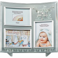 ■透明のガラスにベビーモチーフをプリントし、可愛いメリーチャームを付けました。ベビーギフトにお使い頂けるフォトフレームです。
