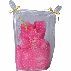 ドレスタイプの女の子用のおむつdeケーキです。ピンクのドット柄は華やかさを演出いたします。38cmと大きくお祝いのお品インパクトが有ります。