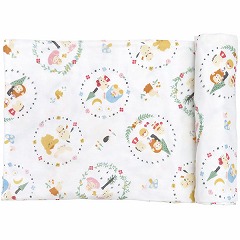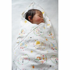 赤ちゃんをしっかり包む綿100%のガーゼおくるみです。ゲップ用のクロスや授乳時のカバーとしても使えます。水彩タッチのキャラクターがカラフルで楽しいデザインになっています。