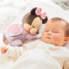 赤ちゃんの心拍数に合わせた曲で心地よい眠りに誘う「ぐっすりメロディ」と、ぐずり泣きに効果があると言われる「胎内音」が入った、ベビーミニーのぬいぐるみ。(※ぐっすりメロディとは、日本音響研究所と共同開発の寝かしつけのために開発されたオリジナル音楽。)胎内音などのやすらぐ環境音が2種類・ぐっすりメロディや子守歌、童謡など6曲収録。ぬいぐるみは手洗い可能。