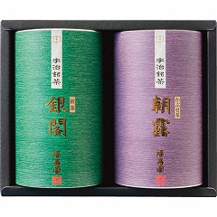 後味のよいすっきりとした旨味のかぶせ茶「朝露」と、程よく旨味と渋味が調和した清涼感のある煎茶「銀閣」。福寿園で根強い人気を誇る、2種類のお茶を詰め合わせたギフトセットです。