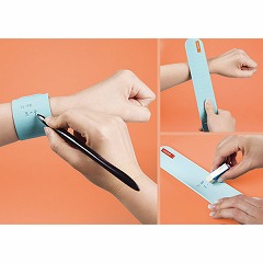 「いつでも どこでも 書ける 思いだせる」をコンセプトに、記憶に対するストレスを低減する発想から生まれたプロダクトです。腕に装着して使用します。油性のボールペンでメモができ、消しゴムや指で消して何度でも繰り返し使用できます。