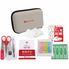 〈商品内容〉●収納ケース・救急手引・ワンタッチ包帯・絆創膏5P(医療機器届出番号:27B3X00138000001)・綿棒10P・コットンパフ3P・爪切り・爪ヤスリ・はさみ・毛抜き×各1