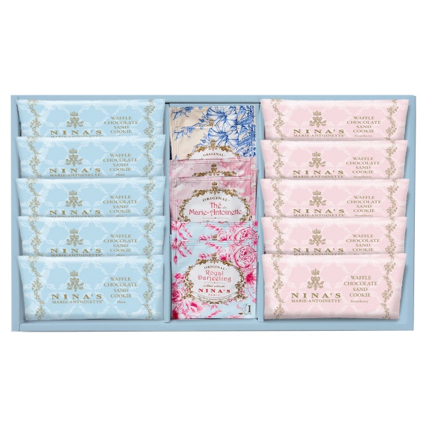 王妃マリー・アントワネットのラグジュアリー・ティーをイメージしたニナスの紅茶と、チョコレートをサンドした香ばしいワッフルクッキーをセットでお届けします。