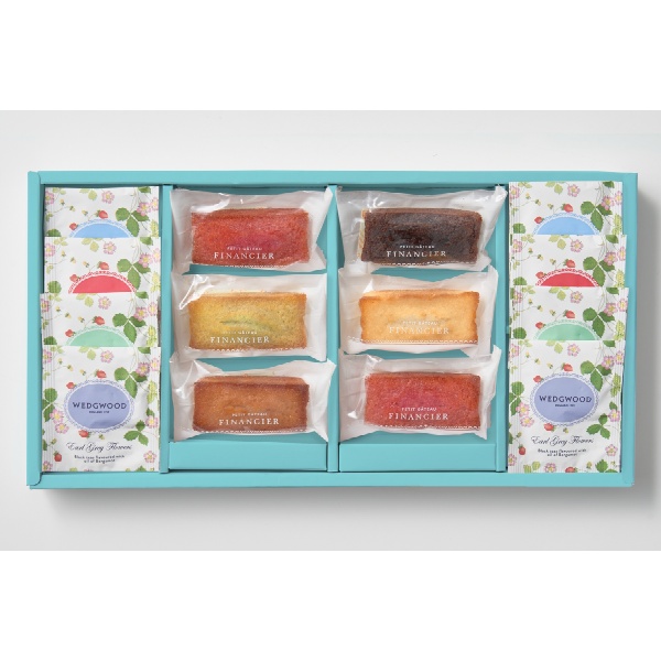 〈内容量〉フィナンシェ(ストロベリー×2個、プレーン・ピスタチオ・チョコ・イチジク×各1個)、ワイルド ストロベリーティーバッグ(ファイン ストロベリー・ピクニック・ウィークエンドモーニング・アール グレイ フラワーズ×各2袋) ※フィナンシェはウェッジウッドの商品ではありません。