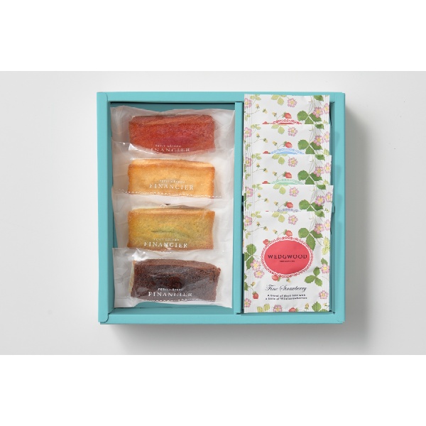 ストロベリー、プレーン、ピスタチオ、チョコの4種類のフィナンシェと、ウェッジウッドの代表柄「ワイルド ストロベリー」の可愛らしいパッケージの4種類のティーバッグをセットしました。