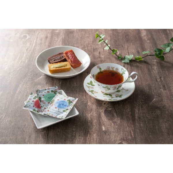 ストロベリー、ピスタチオ、チョコの3種類のフィナンシェと、ウェッジウッドの代表柄「ワイルドストロベリー」の可愛らしいパッケージの4種類のティーバッグをセットにしました。