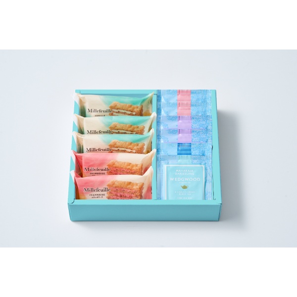 国産小麦100%のパイ生地に、バニラとフランボワーズの2種のクリームをサンドしたミルフイユと、ウェッジウッドの紅茶4種をセットにしました。サクサクのパイと風味豊かなクリーム、そして紅茶の芳醇な香りが口の中に広がる、贅沢なティータイムをお楽しみください。