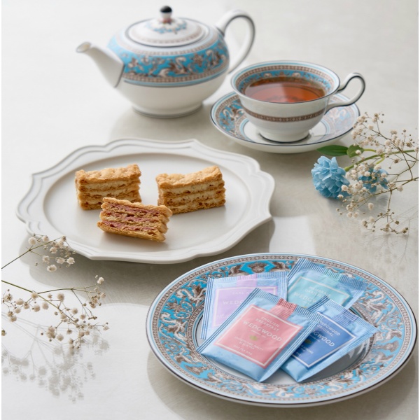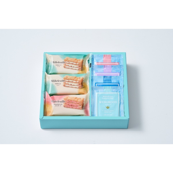 国産小麦100%のパイ生地に、バニラとフランボワーズの2種のクリームをサンドしたミルフイユと、ウェッジウッドの紅茶4種をセットにしました。サクサクのパイと風味豊かなクリーム、そして紅茶の芳醇な香りが口の中に広がる、贅沢なティータイムをお楽しみください。